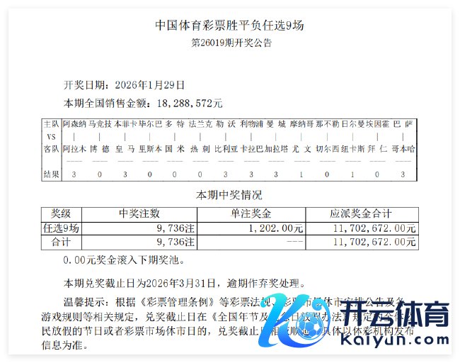 北京时辰1月29日,任九第26019期开奖恶果揭晓。任九开出9736注,单注奖金1202元。本期任九投注总和为18,288,572元。