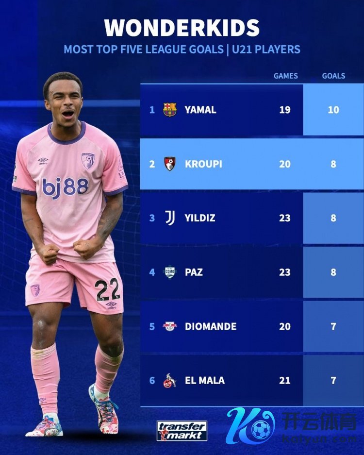 2月10日讯 《转会市集》统计了本赛季五大联赛U21球员进球情况,18岁的亚马尔居首。