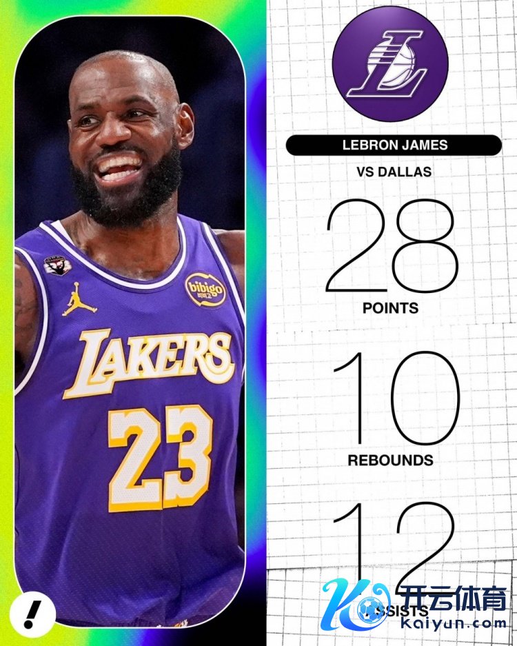 本场比赛,湖东谈主先锋詹姆斯上场35分钟,20投10中得到28分10篮板12助攻。