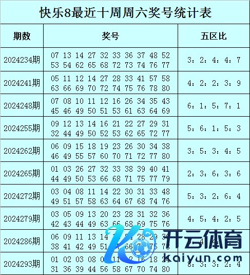 福彩欢欣8第2024293期(上周六)开奖回首:01 02 03 08 09 11 12 16 18 24 31 36 39 44 56 58 67 70 74 80,其中奖号五区比为8:3:3:2:4。