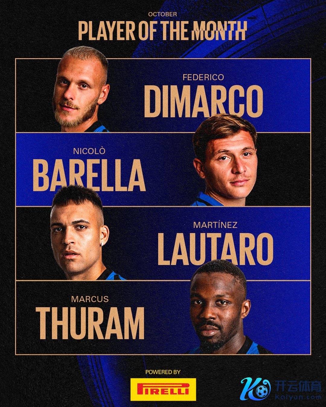 11月9日讯 国米官方公布10月队内最好候选,迪马尔科、巴雷拉、劳塔罗、图拉姆上榜。