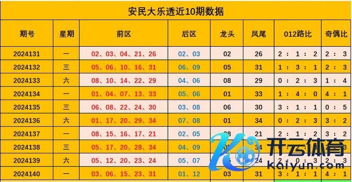 大乐透2024140期开奖奖号:前区03,06体育集锦,15,23,31,后区01,12,前区号码龙头03,凤尾31。012路比3:1:1。奇