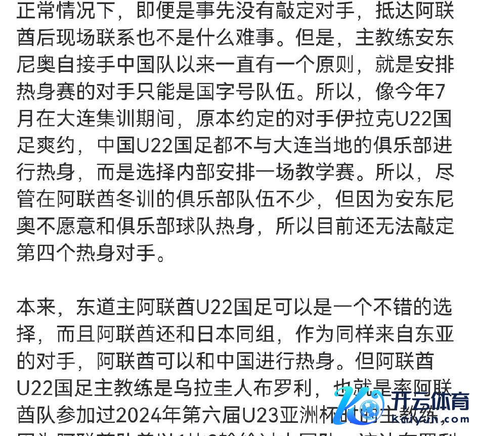安东尼奥坚握要求与国度队进行热身,尤其倾向于对阵U23亚洲杯参赛军队,拒却与俱乐部球队交锋,导致难以找到合适的敌手。因此,原定于12月26日的U22国足热身赛贪图被动取消。