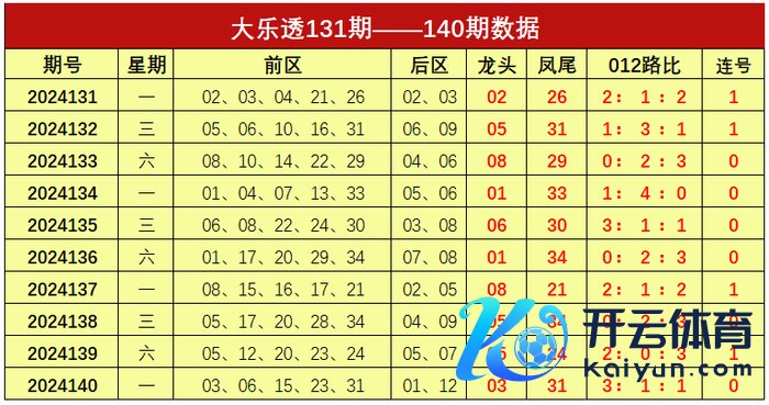 大乐透第2024140期出奖号统计:前区03、06、15、23、31,后区01、12。龙头03,凤尾31,012路比为3:1:1,未开出连号。