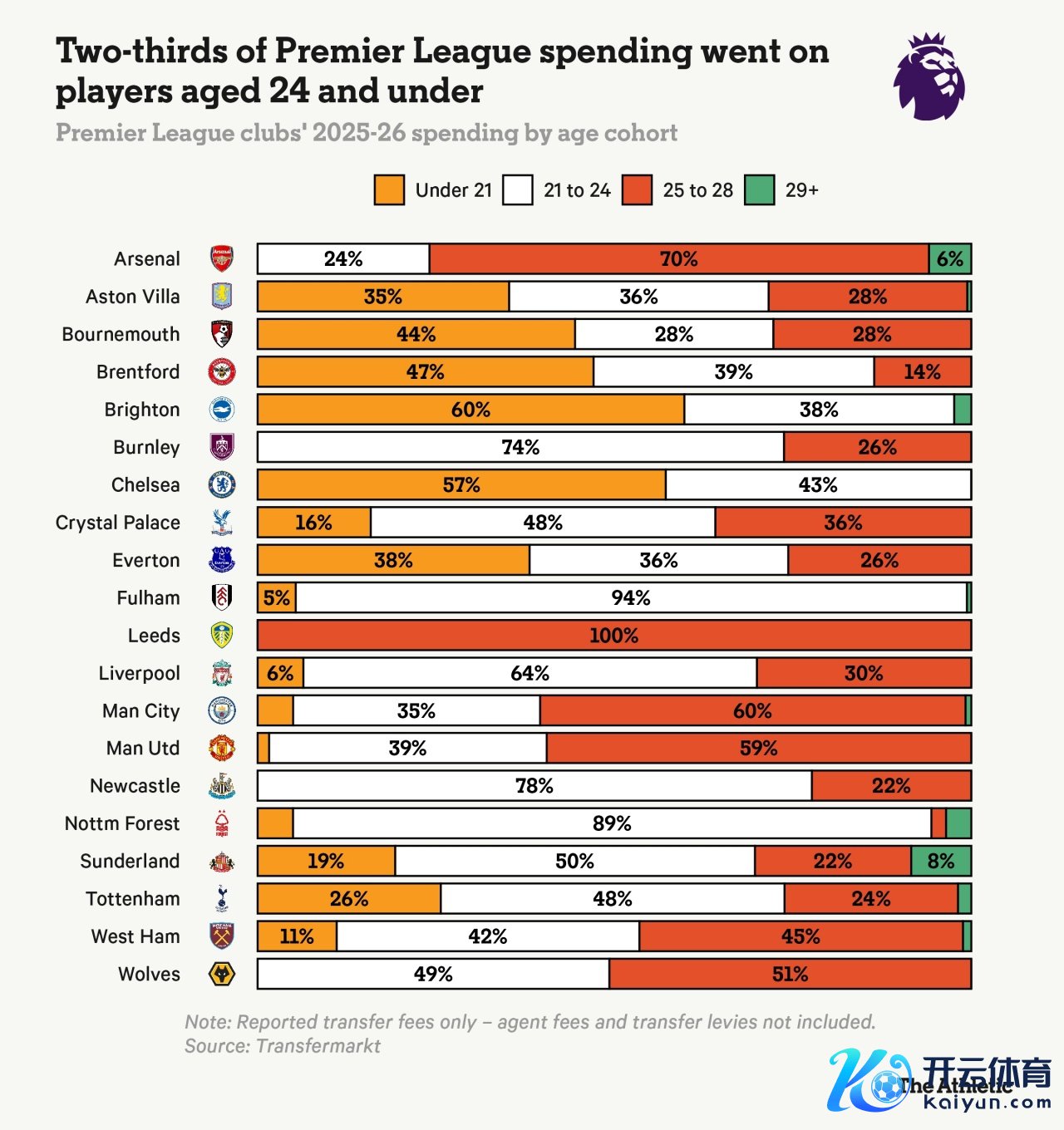 两家曼彻斯特俱乐部则呈现出相同的开销特征,将爽直60%的转会用度于25至28岁的球员。