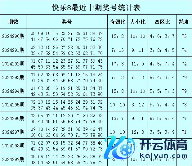 福彩情景8第2024299期开奖转头:05 06 12 14 22 23 25 26 36 39 48 54 58 61 64 68 69 75 76 79,其中奖号奇偶比开出8:12,大小比开出10:10,包含4个小奇号码:05 23 25 39体育赛事直播,6个小偶号码:06 12 14 22 26 36,4个大奇号码:61 69 75 79,6个大偶号码:48 54 58 64 68 76。