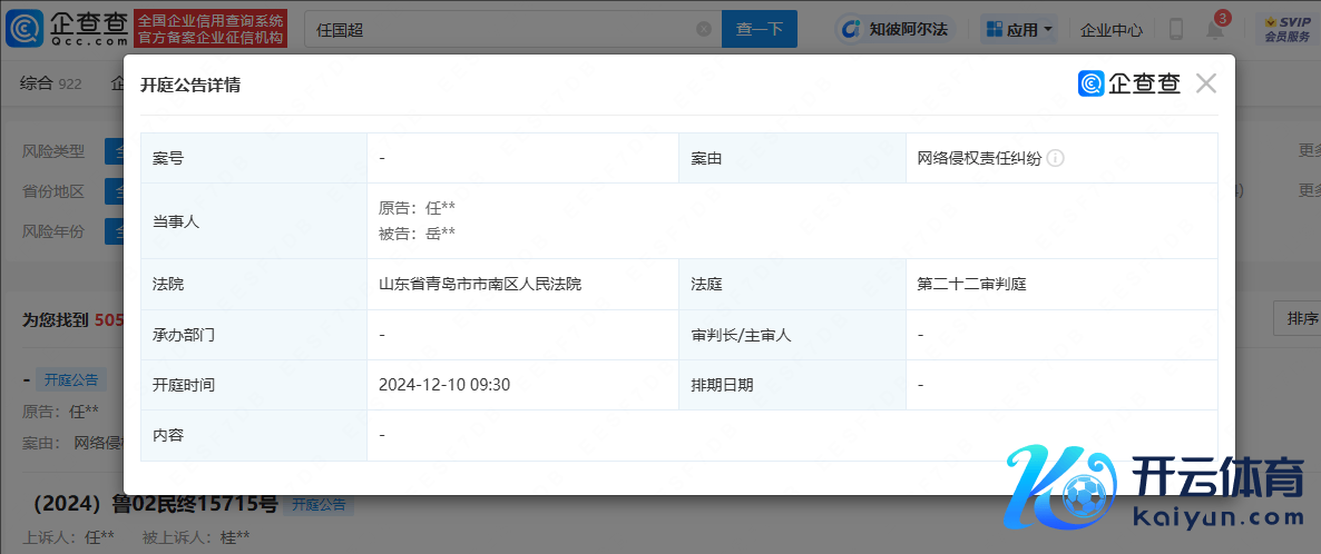 企查查APP清晰体育赛事直播,近日,法院公开任嘉伦(任国超)诉岳某某汇聚侵权纠纷开庭信息。公告清晰,该案件策划将于12月10日9:30在山东省青岛市市南区东说念主民法院开庭审理。